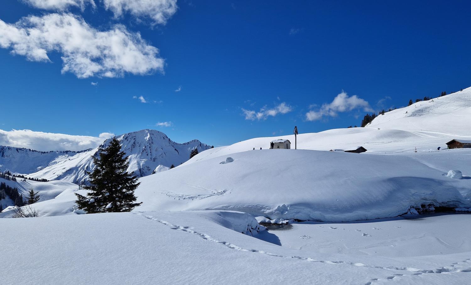 Wir spazieren unter frisch verschneiten Tannen hindurch zu den „Schmusehäuschen“, die Platz für eine Pause zu Zweit bieten. Wenig weiter plätschert links des Wegs ein großer Wasserfall und schon bald erreichen wir den kleinen Ort Damüls mit seiner Zwiebelturmkirche. Wir statten dem Bauernmarkt einen Besuch ab und kehren schließlich auf einen Apfelstrudel im Damülser Hof ein.
