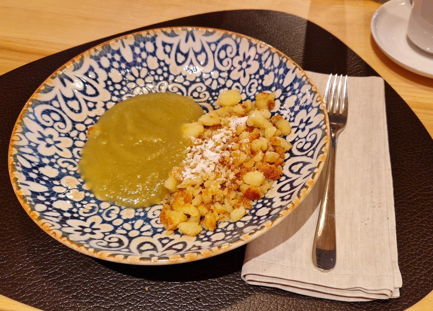 Durch das ständige Stochern und Zerteilen, also das Riebeln, entsteht der eigentliche Riebel in Form von gebräunten Grießklümpchen. Wir lassen uns die Spezialität mit Apfelmus schmecken und begeben uns anschließend auf die erste Etappe.
