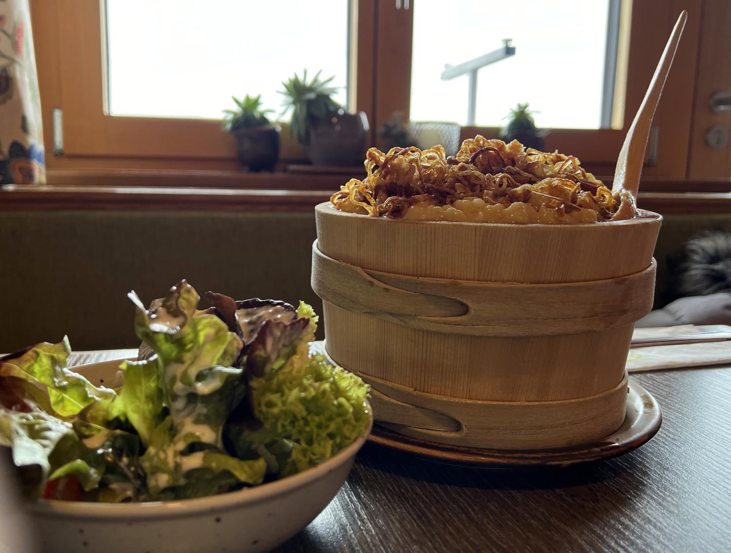 Schon seit jeher stärken sich viele Einheimische im Bregenzerwald mit einer Portion Riebel zum Frühstück. Auf uns wartet zwar keine anstrengende Arbeit auf der Alm, doch die rund zehn Kilometer lange kulinarische Winterwanderung rund um Damüls ist bei frischem Neuschnee auch eine Herausforderung.